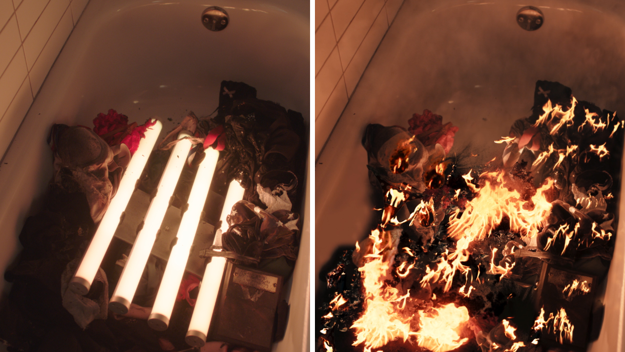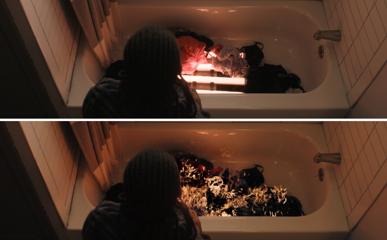 Because of tight production schedules, we decided to bring in CGI fire, smoke and steam using a combination of Fume FX, 3D tracking and interactive re-lighting. many scenes are just single shots that are over 2 minutes in length which required large amounts of roto-scoping and rebuilding, as actors go back and forth. One scene need the actor to carrying CG clothing that is set on fire. Other shots needed interactive "dope smoke" or digital bathroom steam with dripping water vapor being added to mirrors and shower tiles to help sell the look.