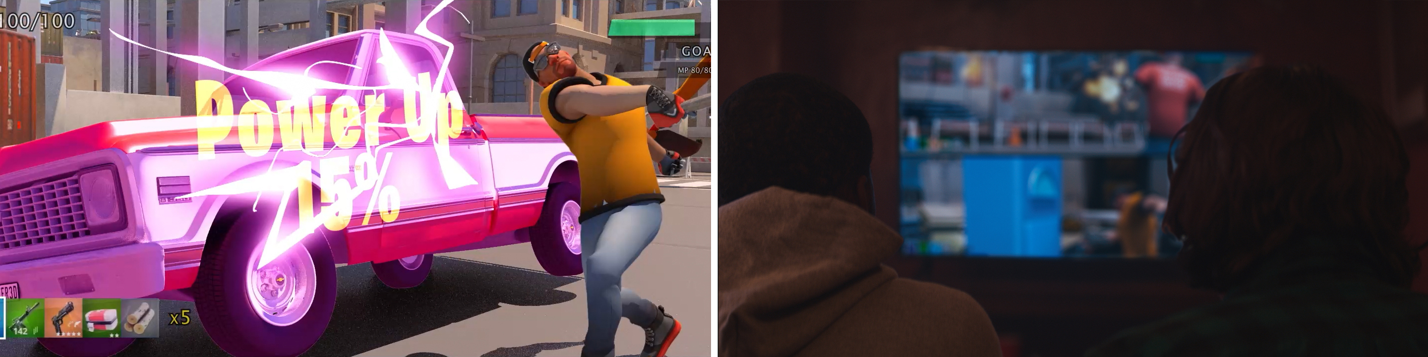 We needed to quickly design and develop a convincing "AAA" video game title that would prominently feature in several episodes. Creative Director Leslie Allen utilized his previous video game design expertise using Epic’s Unreal Engine and Autodesk 3ds max to create something truly uniquely fun. The gameplay rapidly moves across a virtual city's rooftops with characters animated using of keyframe and motion capture. Active gameplay elements were coded using Unreal Engine’s Blueprint. 1 & 2 players versions of the game were outputted as a video loop to work seamlessly with different takes.